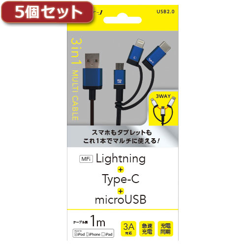 5個セット エアージェイ 3in1マルチケーブル(micro+Type-C+Lightning) BL UKJ-LMC100BLX5