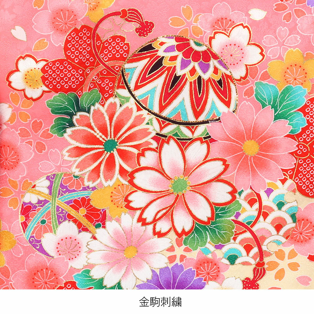 着物全体には桜・菊などの花々が咲き誇り、女の子らしい優雅で麗らかなデザインが魅力的。