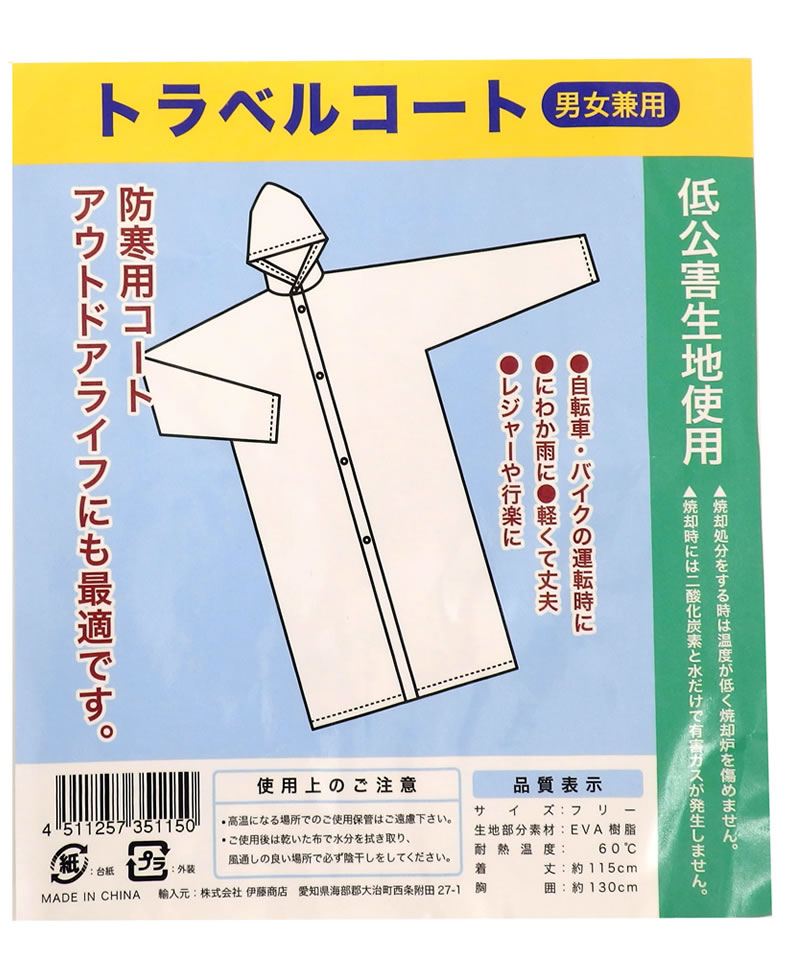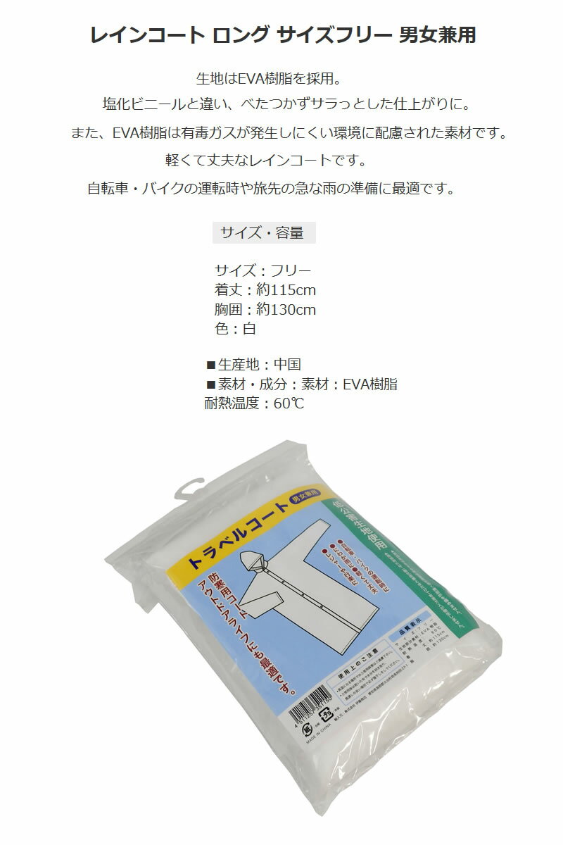【素材、サイズ・全て約】 サイズ:フリー 着丈:約115cm 胸囲:約130cm 色:白 素材:EVA樹脂 耐熱温度:60℃ ●レイングッズ・レインコート注意点※必読 ●PCモニターの環境によって、色合い・形状の見え方が若干異なる場合が御座います。
