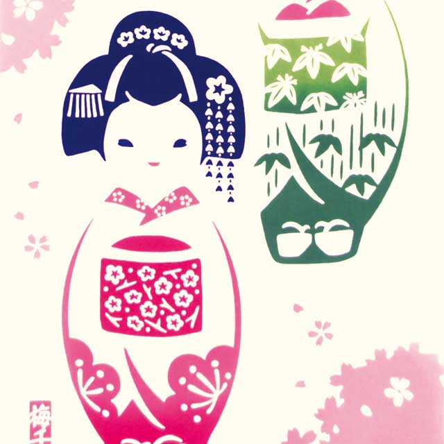 松、竹、梅をあしらった着物を着て、舞妓もお花見にお出かけのよう。