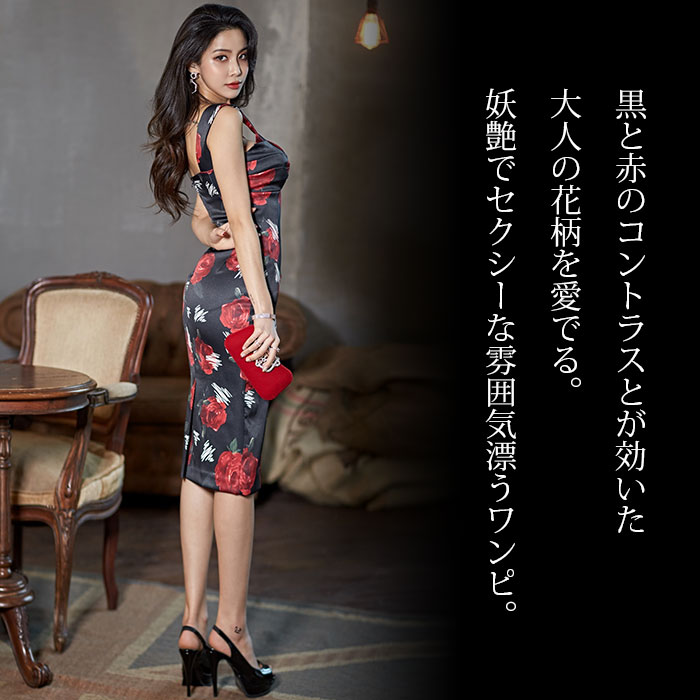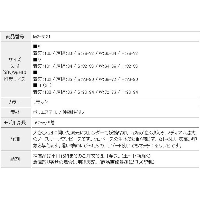 商品番号 ks2-8131 サイズ(cm)※B/W/Hは推奨サイズ ■S着丈:100 / 肩幅:33 / B:78-82 / W:60-64 / H:78-82■M着丈:101 / 肩幅:34 / B:82-86 / W:64-68 / H:82-86■L着丈:102 / 肩幅:35 / B:86-90 / W:68-72 / H:86-90■LL(XL)着丈:103 / 肩幅:36 / B:90-94 / W:72-76 / H:90-94 カラー ブラック 素材 ポリエステル / 伸縮性なし モデル身長 167cm/S着 詳細 大きく大胆に開いた胸元にスレンダーで妖艶な赤い花柄が良く映える、ミディアム膝丈のノースリーブワンピースです。