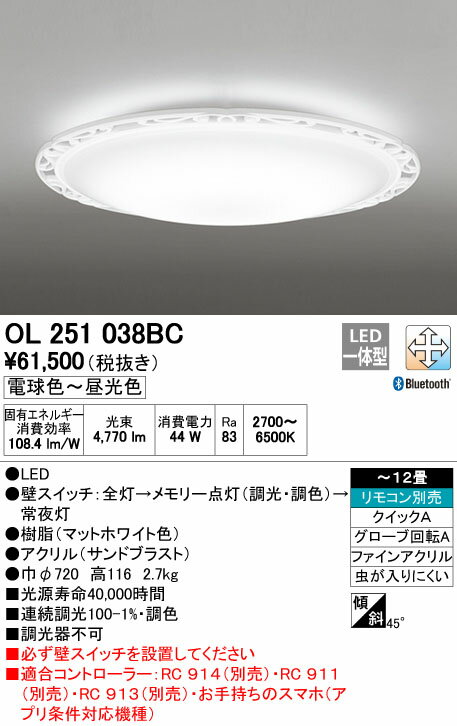 ●商品の関連商品や機能説明などPC用ページに切り替えてご確認下さい 下記リンクから移動出来ます↓↓↓↓↓↓ [ 人気 商品 検索 画面 はこちらから ] 広さ6畳までのおすすめ!広さ8畳までのおすすめ!広さ10畳までのおすすめ! 広さ12畳までのおすすめ!広さ14畳以上のおすすめ!小型タイプ(玄関・廊下・トイレなど) ●関連商品 シーリングライトOL251038 電球色〜昼光色華やかなフレンチレトロの装い 調光・調色タイプ・〜 12畳31,779円シーリングライトOL251039 電球色〜昼光色華やかなフレンチレトロの装い 調光・調色タイプ・〜 10畳29,235円シーリングライトOL251040 電球色〜昼光色華やかなフレンチレトロの装い 調光・調色タイプ・〜 8畳26,693円シーリングライトOL251038BC 電球色〜昼光色華やかなフレンチレトロの装い Bluetooth対応機種 調光・調色タイプ・〜 12畳31,269円シーリングライトOL251039BC 電球色〜昼光色華やかなフレンチレトロの装い Bluetooth対応機種 調光・調色タイプ・〜 10畳28,727円 シーリングライトOL251040BC 電球色〜昼光色華やかなフレンチレトロの装い Bluetooth対応機種 調光・調色タイプ・〜 8畳26,185円